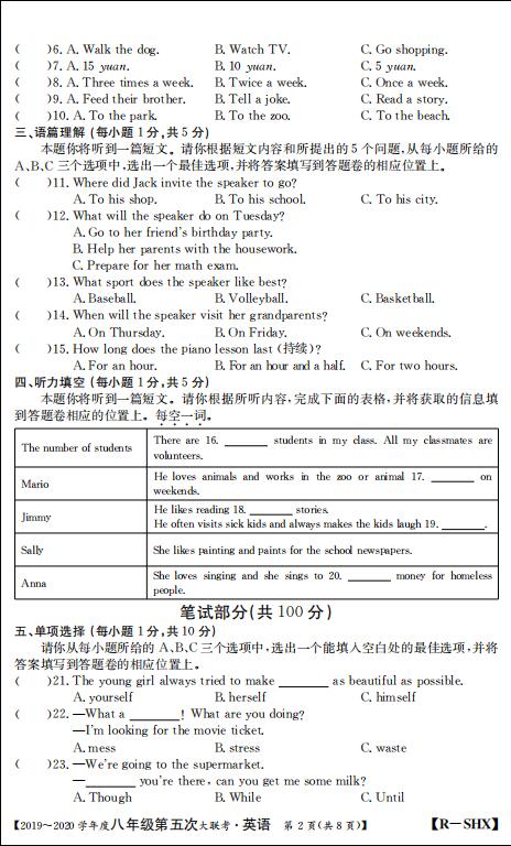 2019-2020山西晉中人教版八年級下英語第五次聯考試題(圖片版)(2)